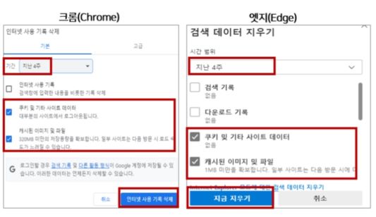 - 쿠키와 캐시 삭제 방법은 하단의 링크 참고하세요.