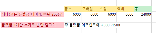 디비 1 달성은 힘들지만 다른 플랫폼을 조금만 더 파면, 한 플랫폼에서 디비 1 순위권에 드는 사람만큼은 이포인트를 딸 수 있겠다! 그래서 적어도 시즌마다 이포인트 최대한으로 모아 재계약권을 쟁이자! 이게 제가 여러 플랫폼에 디비전 등반을 해본 이유고, 이 글을 적게된 이유입니다.