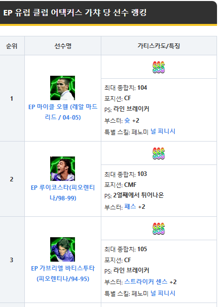 오언과 바티스투타는 라브 그룹 중에서 올인피니싱이 달린 선수들과 비교하면 좋겠죠? 오언은 슈조가 있습니다. 올인 피니싱 라브가 없다면 두명 다 메리트가 있겠네요.