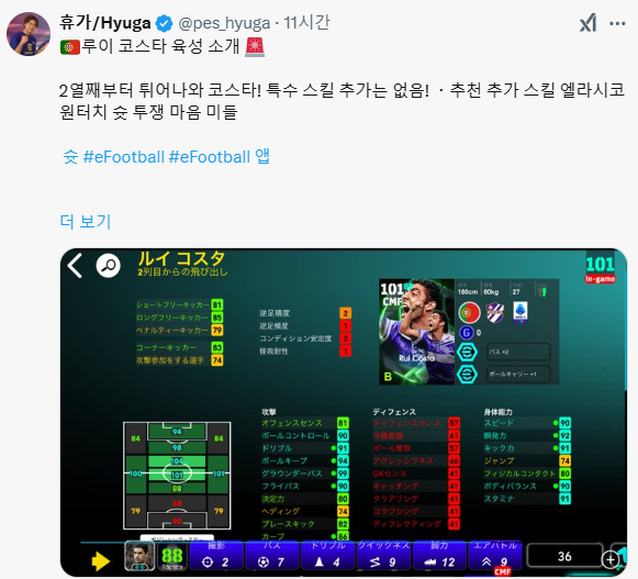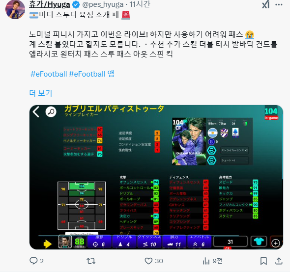 바티스투타는 키가 라브중에선 큰편에 속하고 공중볼도 어느정도 되는, 킥파가 최상급. 아쉬운 건 패스가 좀 낮다는 것이랑 발밑이 별로라는 것, 기존 바티스투타랑 비교해서 많이 좋아졌다는 점. 순속도 아주 좋습니다. 공센도 아주 좋네요. 몸빵도 됩니다. 양발이 높음/높음인게 약간 아쉽습니다.