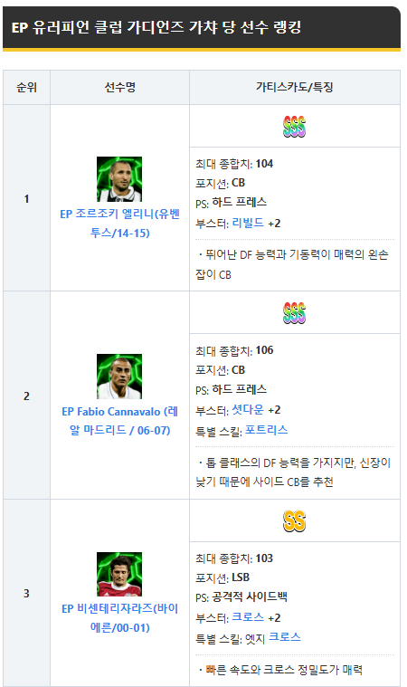 칸나바로나 키엘리니는 스탯은 최상입니다. 그리고 강압 cb로서의 메리트가 있구요, 에픽이니 컨디션 걱정도 없습니다. 다만 키가 상대적으로 작다는 것이 최대의 단점으로 보입니다.