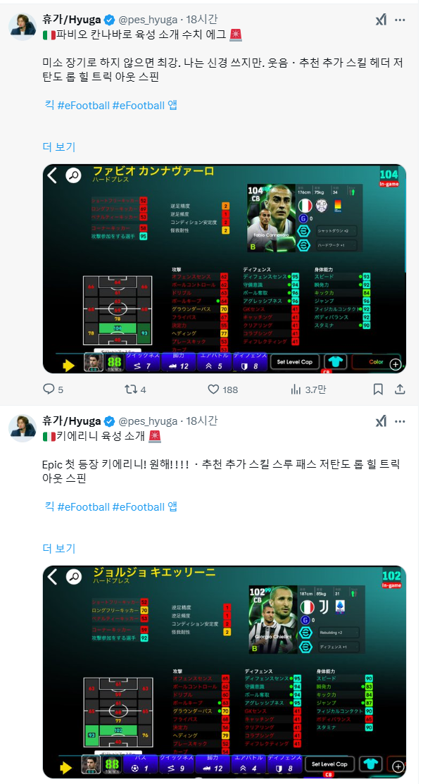 칸나바로는 rb 가능, 키엘리니는 lb 가능입니다. 무플로 써야하구요. 요렇게 쓸 때 스탯이 워낙 좋으니 메리트가 있을 수도 있습니다.