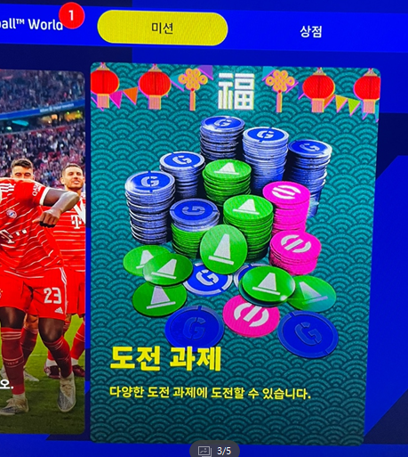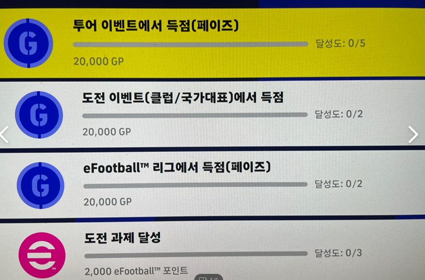 이건 2주짜리 입니다. 남은 시간이 현재 기준으로 13일 남았죠. 즉 1월 26일 오전 11시까지 완료하라는 말입니다. 투어이벤트에서 득점 5점, 도전 이벤트 클럽/국대에서 2점, 리그에서 2점을 달성하면 도전과제 3개가 달성되는 것이고 도전과제 3개 달성시 2,000 이포인트를 줍니다.