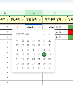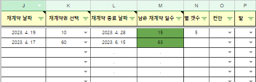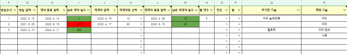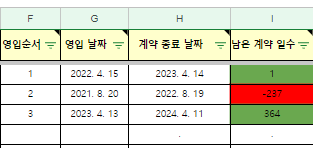 이렇게 날짜를 입력하면 h열에 계약종료 날짜, i열에 남은 계약일수가 자동으로 입력됩니다. 빨간 색은 계약 종료를 뜻합니다.