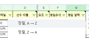 그리고 영입순서를 기록하는 것이 좋습니다. 그 선수의 기준 번호가 됩니다. 선수들을 정렬할 때 좋습니다. 영입날짜를 입력 후 필터링 아이콘을 눌러 a-z순으로 정렬합니다. 그러면 영입날짜/영업순서 번호순으로 정렬이 됩니다. 이 정렬 순서를 기본 순서라고 생각하면 됩니다.
