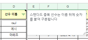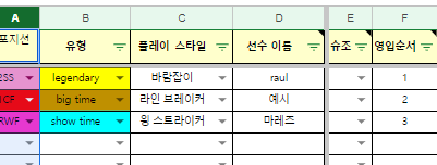 가. e열까지 설명입니다. 정리 대상인 선수만 이름을 입력, 포지션과 유형, 플레이 스타일은 삼각형을 클릭하여 선택하여 정보를 넣습니다.