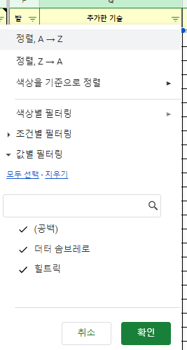 q열에는 추가한 기술 목록을 한셀에 한칸씩 띄어 적습니다. 기술은 두~세글자 정도로 압축하여 적되 헷갈리지 않게 같은 기술은 같은 이름으로 정리합니다. 희망 기술도 희망하는 순서대로 적어놓습니다. 이렇게 해놓으면 편리합니다(하단 그림과 그림의 설명을 참고)